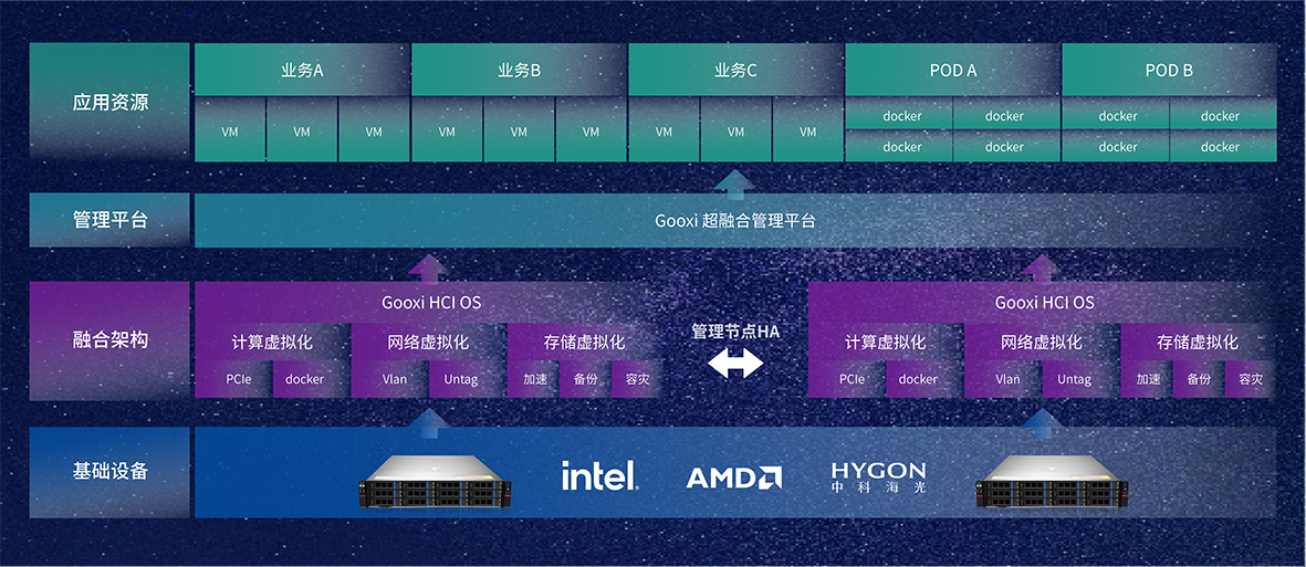 GooxiHCI方案为可以整合存储和计算资源、按需扩展、按需投资。融合部署可以进一步简化IT基础架构,降低系统的总拥有成本,适用于当前“数字化”转型需求的各行各业的通用场景。